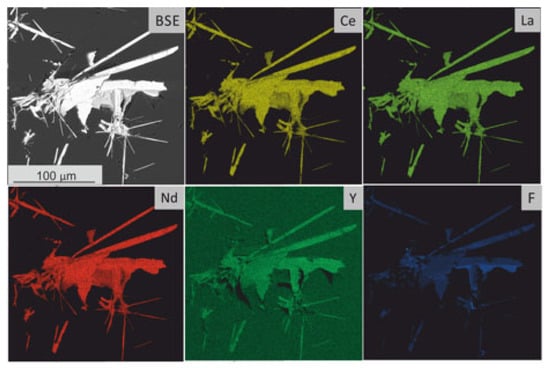 Back-scattered electron (BSE) images and areal distribution of Ca, Ce, La, Nd, Y and F (false colors) in synchysite enclosed in the quartz gangue of the synchysite-bearing quartz–carbonate–sulfide vein in the Rožná uranium deposit. The X-ray distribution maps were collected using an EDS detector on a TESCAN MIRA 3.