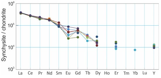 The ΣREE contents of synchysite were found to be very homogeneous (41.8–43.3 wt.% EMPA; Table 3), and the spectra were found to be dominated by LREE (0.60–0.66 apfu of La, 1.18–1.24 apfu of Ce, 0.13–0.16 apfu of Pr, and 0.53–0.65 apfu of Nd). The HREE contents were lower (0.085–0.132 apfu of Sm, 0.04–0.09 apfu of Gd, ≤0.09 apfu of Tb, 0.02–0.05 apfu of Dy, ≤0. 02 apfu of Er, and ≤0.007 apfu of Yb). The content of Y was found to range from 0.017 to 0.23 apfu. The C3-chondrite-normalized pattern (Figure 10) was shown to be very steep, and the LREE⁄HREE ratio was found to range between 47.5 and 136.5 (LaN/YbN) and 21.2–73.4 (PrN/ErN). Synchysite samples displayed negative or no Eu anomalies (EuN/EuN* = 0.309–1.015). The first tetrad effect (t1) was shown to be very weak (0.86 to 1.01), and no cerium anomalies were recorded. Generally, the chondrite-normalized pattern of the analyzed synchysite was similar to the whole-rock REE patterns of the quartz-dominated part of the vein filling (see Figure 7).