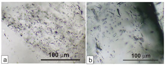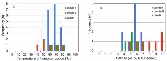 The melting temperatures of ice of the inclusions in the calcite II had values from −2.9 to −6.6 °C, and the salinity of the aqueous fluid corresponded to values from 4.8 to 10 wt.% NaCl equiv. The melting temperatures of ice in the quartz were measured between −2.4 and −3.6 °C, which indicated the salinity of the aqueous fluid to be between 4 and 5.9 wt.% NaCl equiv. (Figure 12b), therefore indicating a possible admixture of saline brines. The temperature of the first melting was observed only in some inclusions. The presence of Te between −35.6 and −38.4 °C probably indicates NaCl and possibly MgCl2 and FeCl2 in the aqueous fluid.