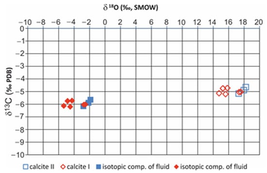 For stable isotope studies, samples of vein carbonates were gently spread in an agate bowl and decomposed in 100% phosphoric (V) acid in a vacuum at 25 °C overnight [33]. The composition of isotopes δ13C (‰) and δ18O (‰) in the released CO2 was measured with a Delta V mass spectrometer in laboratories of the Czech Geological Survey. The total error of isotopic composition determination was ±0.1 ‰. The isotopic composition of carbon is related to the Pee Dee Belemnite (PDB) international standard. The values of the oxygen isotopic composition related to the Vienna Standard Mean Ocean Water (SMOW) standard were determined from the values measured against the PDB standard by recalculation. The isotope composition of oxygen and carbon in calcites I and II was recalculated to the isotopic composition of oxygen and carbon in the fluid phase [34].