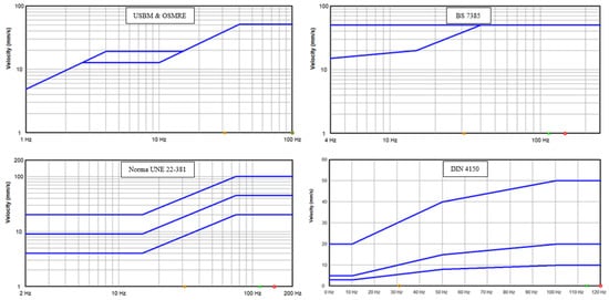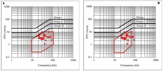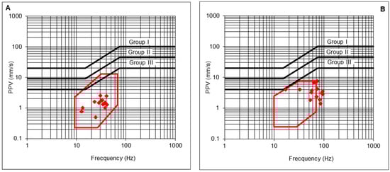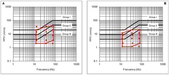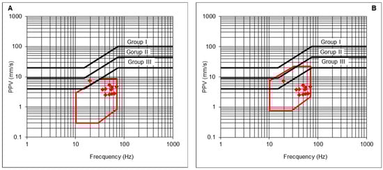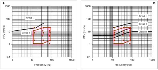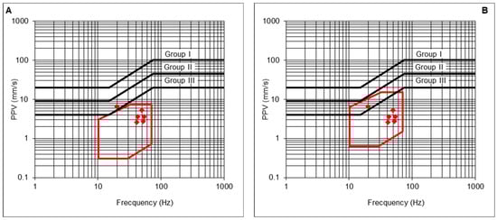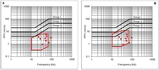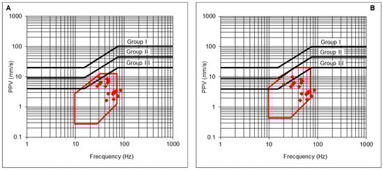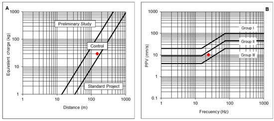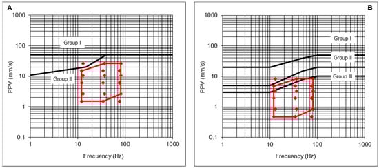 - The maximum PPV admissible for the protection of Group II structures, with its corresponding frequency vGII, is determined from the prevention criterion defined in the UNE 22381 [44] standard (Equation (21)). In addition, a reduction coefficient cs could be applied as a more restrictive safety criterion, if needed;