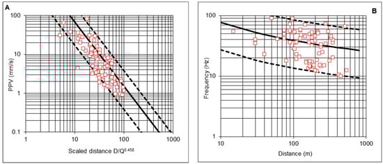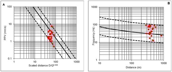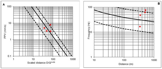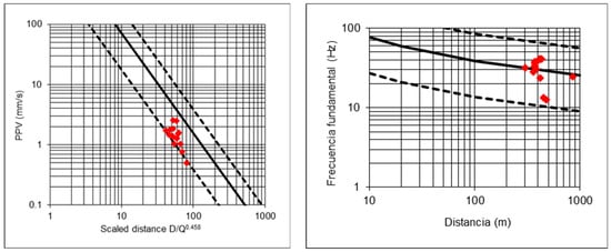 - The maximum and minimum charges per delay, Qmax and Qmin, that can be used are determined, so that vlim is not exceeded at distances Dmax and Dmin. Thus, the attenuation vibration law is used, considering that PPV can be cvmax times the value estimated by Equations (22)–(24);