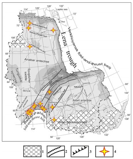 The confinedness of the Meso-Cenozoic tectonic-magmatic activation to these paleorifts is argumentatively proved in the works of V.I. Timofeev [] and V.A. Mikhailov []. Indeed, the Tabasyndskaya anticline and 12 small folds formed due to the impact of the Mesozoic tectonic-magmatic activation were identified in the zone of the Kempendyai dislocations (Vilyui paleorift).
