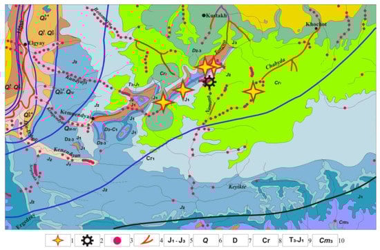 The location of placers in the area of the Kempendyai dislocations, whose sources were hydrothermal metasomatic formations (sideritized siltstones, argillizated rocks, quartz-carbonate veins). Conventional symbols: 1—ore occurrences; 2—volcanic pipe; 3—stream sediment samples, containing gold; 4—explored placers. Deposits: 5—Quaternary; 6—Cretaceous; 7—Jurassic; 8—Triassic; 9—Devonian; 10—Cambrian. The scheme is based on the map of the gold content of Western Yakutia, 2001, scale 1: 1,500,000.
