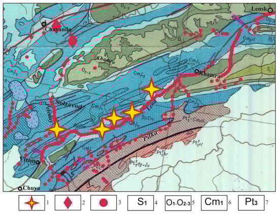 The proposed objects of gold-bearing hydrothermal-metasomatic formations of the Baikal-Patom thrust belt (Pilkinsky thrust), which caused the formation of placers in the basin of the middle Lena River on the section of the Vitim-Hamra rivers: 1—supposed ore sources; 2—ore occurrences; 3—stream sediment sample), containing gold. Deposits: 4—Silurian; 5—Ordovician; 6—Cambrian; 7—Upper Proterozoic. The scheme is based on the map of the gold content of Western Yakutia, 2001, scale 1: 1,500,000.