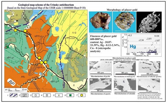 - Glushkova, E.G.; Nikiforova, Z.S. Primary Sources of Placer Gold of the Urinsky Anticlinorium (South-East of the Siberian Platform). Pac. Geol. 2013, 32, 118–123. [Google Scholar]