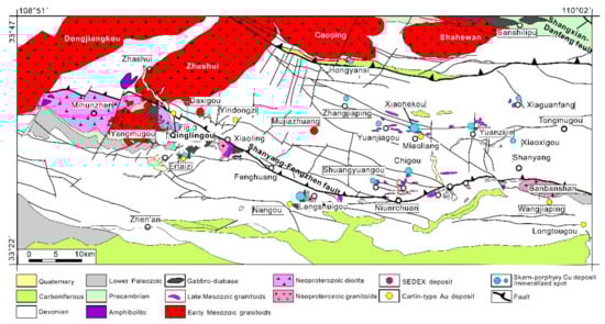 - Xiong, X.; Zhu, L.M.; Zhang, G.W.; Zheng, J.; Jiang, H. Insights into the skarn Cu mineralization processes of an intracontinental setting: A case study of the Xiaohekou deposit, Southern Qinling Orogen, China. J. Geochem. Explor. 2021, 230, 106862. [Google Scholar] [CrossRef]