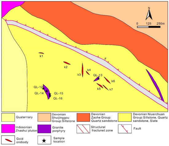 - Huang, J.; Wang, J.Y.; Wei, L.M. Geological characteristics and genesis of the Liba gold deposit, Gansu province. Miner. Depos. 2000, 19, 105–115. [Google Scholar]
