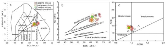 - Jiang, Y.H.; Jin, G.D.; Liao, S.Y.; Zhou, Q.; Zhao, P. Geochemical and Sr-Nd-Hf isotopic constraints on the origin of Late Triassic granitoids from the Qinling orogen, central China: Implications for a continental arc to continent-continent collision. Lithos 2010, 117, 183–197. [Google Scholar] [CrossRef]