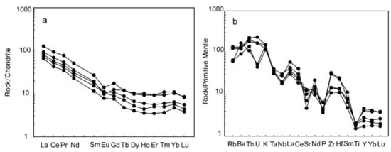 - Sun, S.S.; McDonough, W.F. Chemical and isotopic systematics of oceanic basalts: Implications for mantle composition and processes. Geol. Soc. Lond. Spec. Publ. 1989, 42, 313–345. [Google Scholar] [CrossRef]