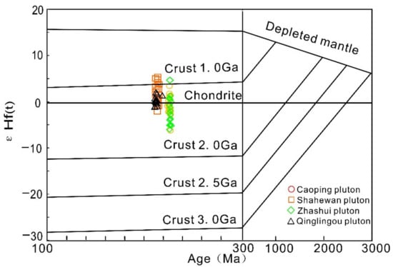 - Gong, H.; Zhu, L.M.; Sun, B.Y.; Li, Z.; Guo, B. Zircon U-Pb ages and Hf isotope characteristics and their geological significance of the Shahewan, Caoping and Zhashui granitic plutons in the South Qinling orogen. Acta Petrol. Sin. 2009, 25, 248–264. [Google Scholar]