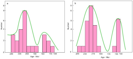 | Jinlongshan | Sericite | Ar-Ar | 232.7 ± 6.9 | [50] | |