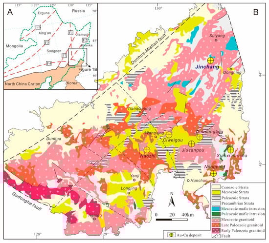 The Yanbian–Dongning region, located at the eastern margin of Northeast China (Figure 1), mainly experienced the final closure of the Paleo-Asian Ocean in the late Permian–Middle Triassic [1,2,3,4,5,6,7] and the subduction of the Paleo-Pacific Plate in the Mesozoic–Cenozoic [6,8]. As a typical superposition area of the Paleo-Asian Ocean and Paleo-Pacific regimes, the Yanbian–Dongning region contains large-scale magmatic rocks and hosts a series of endogenous Early Cretaceous Au deposits of various types, including the large Jinchang porphyry Au deposit [9], the medium Naozhi intrusion-related Au deposit, and the small Jiusangou epithermal Au deposit [10]. The majority of the Au deposits are genetically related to the emplacement activities of the Early Cretaceous magmatic rocks, caused by the Paleo-Pacific subduction [9,10,11].