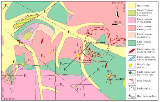 The Jinchang Au deposit is located ~32 km northwest of the Dongning City in the Yanbian–Dongning region (Figure 2). The Triassic Luoquanzhan Formation, exposed in the northwestern and southeastern parts of the ore district (Figure 2), primarily consists volcanic rock series, including dacitic breccia crystal tuff, andesitic crystal tuff, and hornblende andesite [9,12,13]. Structures in the ore district are dominated by a set of NE–SW-trending compressive shear faults (F1–F5) formed first, a set of NW–SE-trending compressive shear faults (F6–F7), a set of E–W-trending tensile faults (F8–F13), and a set of N–S-trending compressive faults (F14–F17; Figure 2). In addition, a set of well-developed ring fractures are distributed in the eastern ore district, and hosts a series of Au-bearing sulfide-quartz veins (Figure 2). The exposed igneous rocks in the ore district can be placed in six categories according to their petrography and zircon U–Pb ages, composed of a Late Triassic medium-grained diorite (209.5 ± 1.4 Ma) [15], an Early Jurassic medium- to fine-grained biotite granodiorite, fine-grained syenogranite, medium-grained monzogranite (206–185 Ma) [25,29,30,31], and the Early Cretaceous porphyritic diorite and granite porphyry (Figure 2) [9,12]. The Late Triassic diorite and the Early Jurassic granitoids occupy the majority of the ore district, whereas the Early Cretaceous porphyritic diorite and granite porphyry generally occur as small NE–SW-trending dykes that intrude the older intrusions (Figure 2). In addition, two concealed igneous rocks, monzonite and granodiorite near the J0 and J11 Au-bearing breccia pipes, are constrained to 115 ± 3 and 107 ± 2 Ma, respectively [9,12].