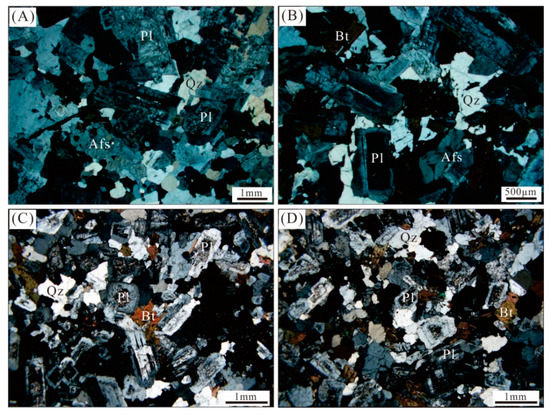 Representative photomicrographs (crossed polarized light) for concealed rock samples in the Jinchang ore district. (A) Monzogranite (sample GSJ1) from the drill hole JIZKN01; (B) monzogranite (samples GSJ18) from the drill hole J18ZK0303; (C,D) granodiorite (sample GSJ11) from the drill hole JXI-1ZK1001. Abbreviations: Afs = alkali feldspar; Bt = biotite; Pl= plagioclase; Qz = quartz.