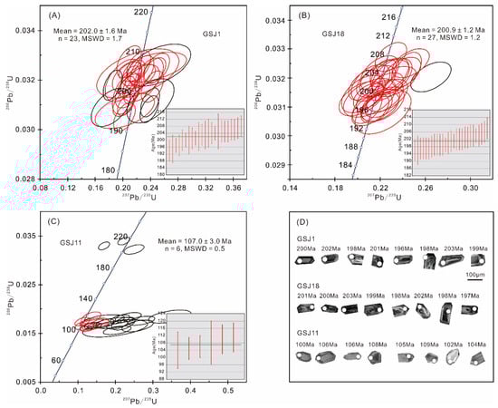 Six analyses with high discordance degrees (>10%) among 29 spots of zircons obtained from the sample GSJ1 and the remaining 23 zircons of discordance degrees of ≤10% yielded 206Pb/238U ages of 208 to 194 Ma (Table S1). All the U–Pb data are plotted in the concordia diagram, with the > 10% discordance degree data shown in black (Figure 4A). The data for the 23 U–Pb of low discordance degrees (≤10%) have a weighted mean 206Pb/238U age of 202.0 ± 1.6 Ma (MSWD = 1.7; Figure 4A).