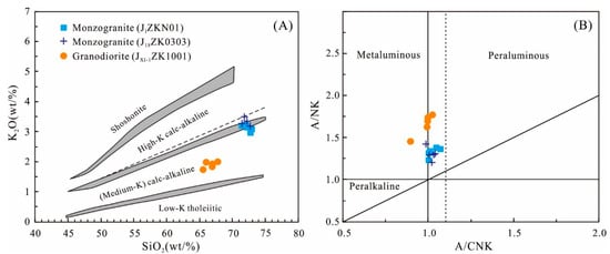 Plots of (A) K2O vs. SiO2 (after Peccerillo and Taylor [42]) and (B) A/NK [molar ratio Al2O3/(Na2O + K2O)] vs. A/CNK [molar ratio Al2O3/(CaO + Na2O + K2O)] (after Maniar and Piccoli [43]) for the concealed granitoids in the Jinchang ore district. Data of two granodiorite samples are quoted from Cai et al. [9].
