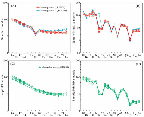 Chondrite-normalized REE patterns (A,C) and primitive mantle (PM) normalized trace element (B,D) diagrams for the concealed granitoids in the Jinchang ore district. Normalizing values are from Sun and McDonough [44]. Data of two granodiorite samples are quoted from Cai et al. [9].