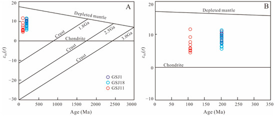 In this study, we focused on the primary zircons that were formed from magma crystallization. Inherited zircons, captured from the wall-rocks, were not used for work on Hf isotopic analysis. The in situ Hf isotopic results of the zircons obtained from the samples GSJ1, GSJ18, and GSJ11 are presented in Table S3 and Figure 7. The 176Hf/177Hf ratios and εHf(t) values of the zircons obtained from the sample GSJ1 range from 0.282850 to 0.282960 and +7.1 to +10.9, respectively, with the two-stage model ages (TDM2) of 712 to 500 Ma (Table S3). Additionally, sample GSJ18 exhibits similar 176Hf/177Hf ratios of 0.282808 to 0.282969, εHf(t) values of +5.6 to +11.2, and TDM2 of 799 to 481 Ma (Table S3). The zircons from sample GSJ11 yielded 176Hf/177Hf ratios of 0.282833 to 0.283037 and εHf(t) values of +4.4 to +11.5, with TDM2 ranging from 787 to 389 Ma (Table S3).