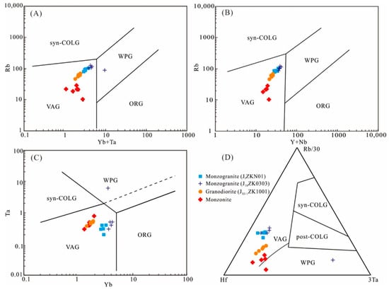 Tectonic discrimination diagrams for the granitoids in the Jinchang ore district. (A) Rb vs. (Yb + Ta); (B) Rb vs. (Y + Nb); (C) Ta vs. Yb (after Pearce et al. [55]). (D) Ternary (Rb/30)-Hf-(Ta×3) (after Harris et al. [56]). The data from the monzonites and two granodiorites are quoted from Cai et al. [9]. Abbreviations: VAG = volcanic arc granites; ORG = ocean ridge granites; WPG = within-plate granites; syn-COLG = syn-collision granites; post-COLG = post-collision granites.