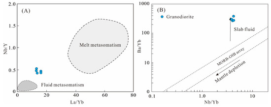 Plots of (A) Nb/Y vs. La/Yb (after Hoffer et al. [65]) and (B) Ba/Yb vs. Nb/Yb (after Chen et al. [66]).