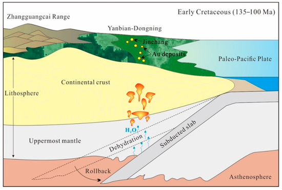 The granodiorite samples were enriched in LILEs and LREEs, depleted in HREEs and HFSEs (Figure 6C,D), and classified as medium-K calc-alkaline series of metaluminous to weakly peraluminous granites (Figure 5A,B). These samples, combined with the coeval monzonites [9], plot into the field of the volcanic arc granites (Figure 9A–D). These geochemical features are indicative of the formation of the Early Cretaceous granodiorite in the continental arc setting. According to previous studies, the widespread Early Cretaceous magmatic rocks with an eastward younging trend in Northeast China were formed in the extensional setting of the back-arc area [6,19,57,58,59] and are interpreted to reflect the rollback of the subducted Paleo-Pacific slab [6,9,14,19,47,60,61,62,63]. Considering the ore-causative granodiorite at Jinchang from the crust–mantle mixed magmas, we infer that the Early Cretaceous subducted slab rollback most likely caused the partial melting of both the mantle wedge and overlying continental crust through fluid release, which is supported by the following points. (1) No anomalies for the ore-causative granodiorites with the precipitation of abundant metal minerals, including pyrite, magnetite, chalcopyrite, and galena [9,12,13,14,15,48] reflect that the separation of the plagioclase as residue phases in the source was insignificant, with the metals being mainly enriched in the magmatic fluids. This is most likely attributed to the water-rich magma sources [64]. (2) The granodiorite samples fall near the range of fluid metasomatism on the Nb/Y vs. La/Yb and Ba/Yb vs. Nb/Yb diagrams (Figure 10A,B), which indicates that the formation of the magmas was related to the fluid metasomatism in the source area. Based on this these combined points, we propose that the Early Cretaceous ore-causative granodiorite of the Au mineralization at Jinchang was formed in the continental arc setting. Additionally, this Early Cretaceous ore-causative granodiorite was derived from the partial melting of the mantle wedge and the overlying Neoproterozoic–Paleozoic continental crust, which was possibly caused by the dehydration and metasomatism of the subducted Paleo-Pacific slab involved in the rollback (Figure 11). The geodynamic setting of the subducted slab rollback supported the widespread Early Cretaceous magmatic–hydrothermal Au mineralization, not only for the Jinchang Au deposit, which formed in the continental arc environment, but for all the other coeval hydrothermal Au deposit formations in the Yanbian–Dongning region in Northeast China, including the Xiaoxi’nancha, Naozhi, Ciweigou, and Jiusangou Au deposits (Figure 1B and Figure 11).