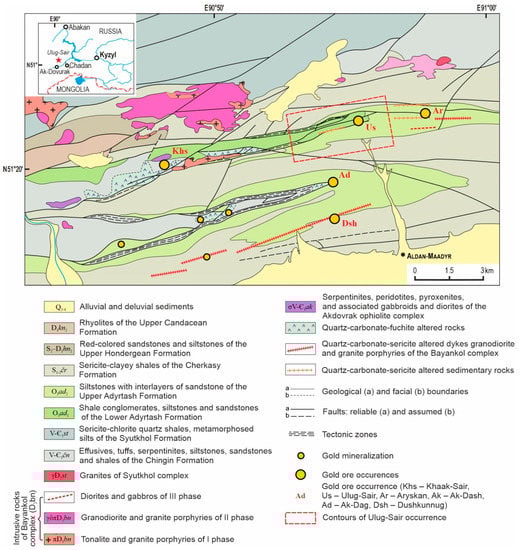 During the geological survey and prospecting activities during the period 1952–1977 in Western Tuva, gold–quartz ore occurrences were discovered (Ulug-Sair, Aryskan, Khaak-Sair, Dushkunnug, Ak-Dag, etc.). In addition, numerous gold mineralizations are associated with medium-temperature quartz–carbonate–sericite- and quartz–carbonate–fuchite-altered rocks. The largest are Khaak-Sair, in quartz–carbonate–fuchsite rocks [], and Ulug-Sai, in conglomerates, siltstones, and quartz–carbonate–sericite rocks. They are located in the AMOC, which is considered one of the most promising for native Au (Figure 1) in the region.