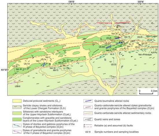 The Ulug-Sair occurrence is confined to the axial part of the near EW striking horst-anticline and complex faults: Arzhansky and “Rudny”, which are accompanied by numerous fractures with angles of 75–90°. The core of the horst anticline is composed of Ordovician conglomerates, siltstones, sandstones, and Vendian–Lower Cambrian ophiolites (exposed west of the ore occurrence), the anticline limbs are composed of Ordovician siltstones, Silurian schists, and siltstones (Figure 1).