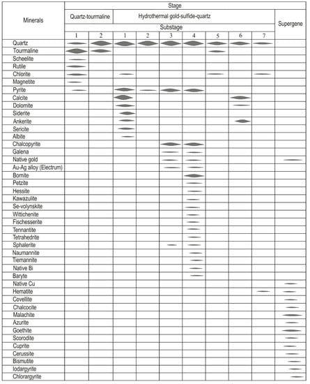 We identified, based on previous works [] and our data, that the earliest high-temperature quartz–tourmaline stage includes two substages: tourmaline and tourmaline–quartz. Gold–sulfide–quartz mineralization includes substages including: pre-ore-altered rocks and pyrite–quartz; gold–sulfide–quartz (I), and gold–telluride–sulfide–quartz (II), as well as post-ore chlorite–quartz, carbonate–quartz, and chlorite–hematite–quartz substages. Limonite, malachite, azurite, goethite, scorodite, cuprite, cerussite, bismutite, iodargyrite, and chlorargyrite are supergenes (Figure 3).