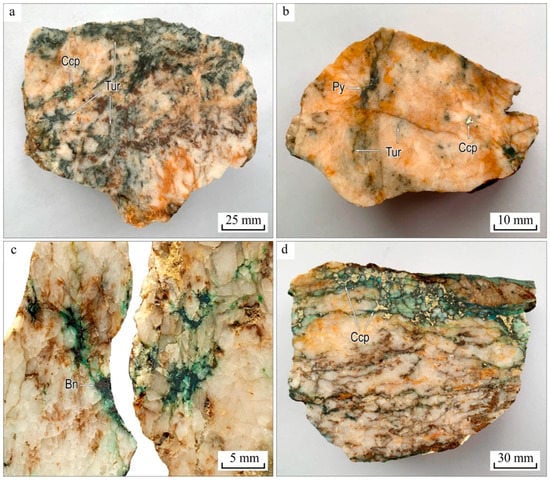 Ore textures of the Ulug-Sair ore: (a,b) vein-disseminated gold–sulfide–quartz ores with chalcopyrite (Csp), pyrite (Py), and early brecciated tourmaline (Tur); (c,d) vein-disseminated gold–telluride–sulfide–quartz mineralization with bornite (Bn) and chalcopyrite (Ccp).