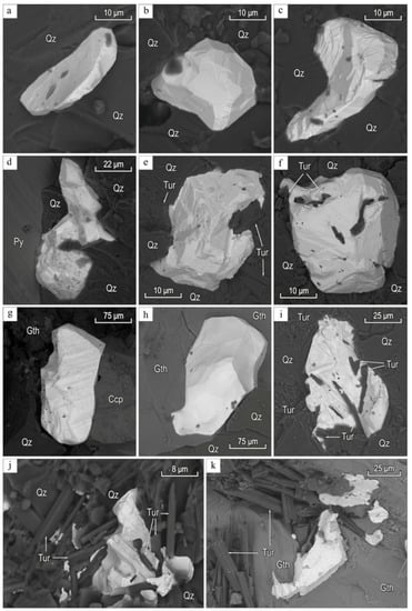 Gold (light) in gold–sulfide–quartz veins in quartz (a–k) with pyrite (d), chalcopyrite (g), and goethite (Gth) (h,k), and tourmaline (Tur, e,f,i–k). BSE images.