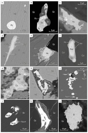 Minerals gold–telluride–sulfide–quartz veins: (a) inclusions of hessite (Hs), and petzite (Pz) in chalcocite (Cct); (b) inclusions of hessite (Hs), petzite (Pz), and bornite (Bn) in quartz (Qz); (c) inclusions of hessite (Hs), and chalcocite (Cct) in quartz (Qz); (d) intergrowth of Se-volynskite (Vln) with hessite (Hs), in chalcocite (Cct); (f) intergrowth of Se-volynskite (Vln) with hessite (Hs), in chalcocite (Cct); (e) intergrowth of wittichenite (Witt) with hessite (Hs) in bornite (Bn), chalcocite (Cct), and quartz (Qz); (f) intergrowth of kawazulite (Kwz) with wittichenite (Witt), and hessite (Hs) in chalcocite (Cct); (g) intergrowth of native bismuth (Bi), cuprite (Cpr), and native copper (Cu) in malachite (Mlc); (h) inclusions of fischesserite (Fsch) in chalcocite (Cct); (I,j) inclusions of naumannite (Naum), tiemannite (Tiem), and Se-galena (Se-gn) in bornite (Bn); (k) gold (Au), and and goethite (Gth) in quartz (Qz); (l) inclusions of electrum (El) in quartz (Qz), and goethite (Gth). BSE images.