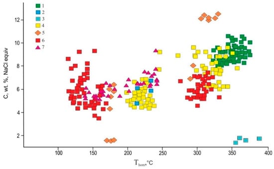 Homogenization temperatures vs. salinity plot of fluid inclusions in quartz: 1—quartz–tourmaline metasomatites; 2, 3—quartz–carbonate–sericite-altered rocks (2—Ps, 3—P); 4, 5—gold–sulfide–quartz veins (I) (4—P, 5—Ps); 6, 7—gold–telluride–sulfide–quartz veins (II) (6—P, 7—Ps). P—primary, Ps—pseudosecondary fluid inclusions.