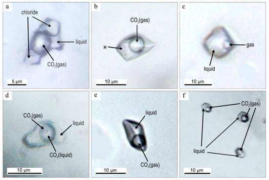 Fluid inclusions in quartz of the Ulug-Sair ore occurrence: (a) VLS primary (sample US-4); (b) VL pseudosecondary (sample US-4); (c) VL secondary (sample US-4); (d) VLC primary (sample US-40a); (e) VL primary (sample US-40a); (f) VL primary/pseudosecondary (sample US-40a). FIA see in Table 2.