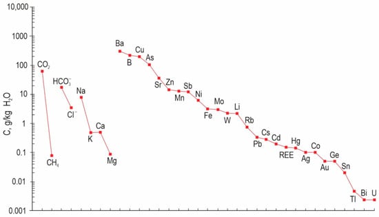 The fluid salinity up to 12.51 wt % NaCl eq. and a complex composition with Na, K, and Mg chlorides, Na hydrocarbons, and borates indicate the involvement of fluid of magmatic origin. The elevated amounts of boron in fluid and the presence of “magmaphile” elements (W, Sb, Mo, Sb) also confirm involvement of the magmatic genesis of the fluid [,].