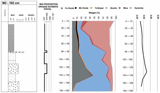 Kaolinite (>70%) is the predominant mineral in the top fine layer. Quartz content increases with depth together with iron oxide that reaches >40% in the 140–146 cm sample (Figure 4). Most of the density values range from 2.5 to 2.9, but they correlated with Fe oxide content and density values up to 3 are observed. Data from M2 is considered to be a reference for natural (pre-dam failure) sediments in the Paraopeba watershed.