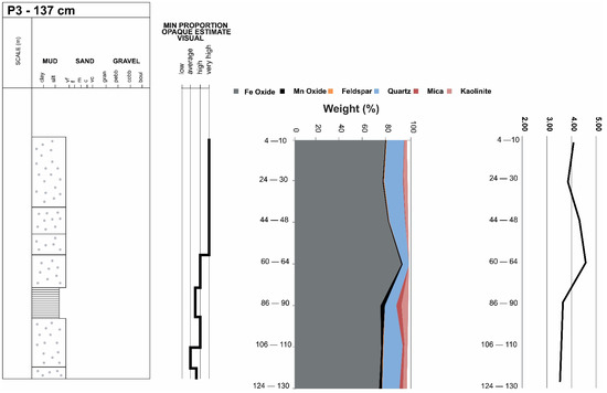 The P19 borehole is located approximately 30 km downstream from the confluence of the Ferro do Carvão creek and Paraopeba river. The core obtained reached 116 cm in length (Figure 9). Opaque minerals are present in medium to high concentrations up to 58 cm deep (top to bottom), mostly found among fine sand and silt grains (Figure 3e). Below 60 cm depth, there is a fine layer composed of medium to fine sand grains (~80 cm) in between mud layers. Despite the grain size reduction, high concentrations of opaque minerals are not observed.