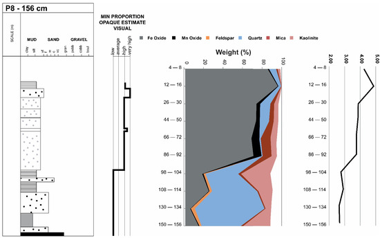 The P8 borehole is located approximately 10 km downstream from the confluence between Ferro Carvão creek and the Paraopeba river. The core is 156 cm in length. In the first meter (top to bottom), the silt-clay fraction is predominant consisting as an unstratified mud with high opaque mineral content (Figure 3c). This layer is mainly composed of Fe oxides with density values ranging upwards to 3.5 (Figure 7). In deeper levels, small fining upward cycles are observed, and quartz becomes the predominant mineral.