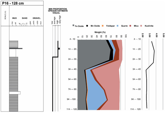 Mineralogical images obtained by QEMSCAN (Figure 11) confirm patterns in the data previously described, with higher iron and manganese oxide concentrations (brownish color) observed in shallower portions of cores P3, P8, P16 and P19. The mineral association of natural (pre-failure) sediments can be assumed from core M2 where kaolinite, quartz and muscovite are predominant, but plagioclase, microcline and iron oxide may be observed in deeper portions. Similar mineral assemblages can be observed below the top oxide-rich layers in P3, P8, P16 and P19 (yellow-reddish colors).
