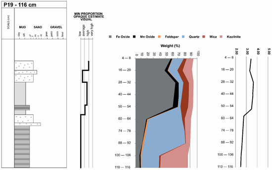 Figure 9. Multiproxy display of results obtained from P19 samples. From left to right one can observe the log with textural description, opaque relative proportions, modal mineralogy and density. Sampled intervals are indicated by the horizontal axis on the last two charts.