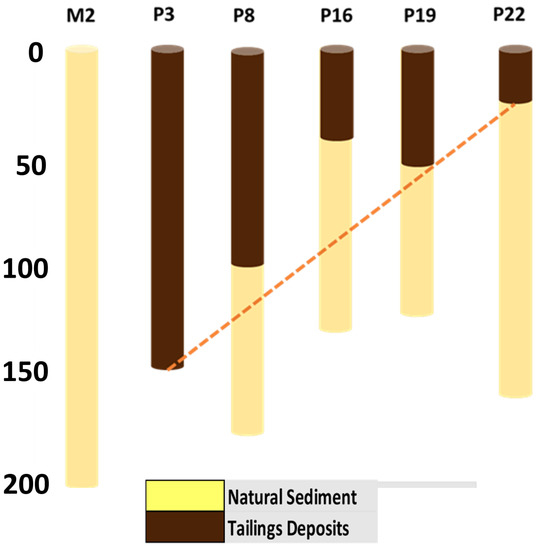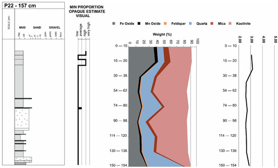 The P22 borehole is located almost 40 km from the tailings entrance point in the Paraopeba river. The retrieved core is 158 cm long (Figure 10). Mud deposits can be observed along the entire profile, sometimes interlayered with fine beds of silt and fine sand. Opaque mineral concentration varies from high to low in the first 20 cm deep (Figure 3f) and is predominantly low along the remaining sample length.