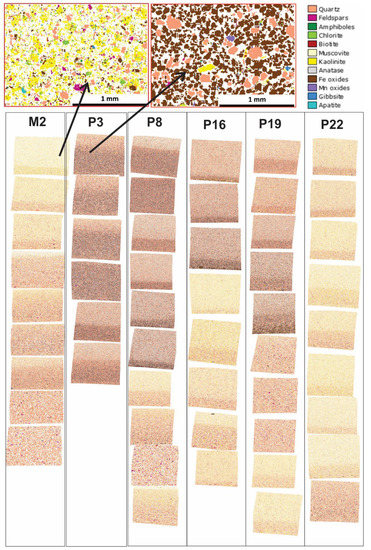 The SEM images of samples P16-03 and P19-02 (Figure 4D,E) are characterized by the greater presence of biotite, quartz and muscovite in relation to iron oxides. In P22-01 (Figure 4F) there is an increase in particle size/granulometry and a significant reduction in the presence of iron oxides.