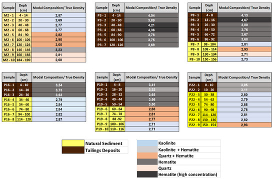 Natural sediments from Core M2 and basal sediments in the remaining cores are distinguished by the following mineral associations: kaolinite, quartz + hematite, quartz and kaolinite (higher concentration). Hematite-bearing strata occur sporadically and punctually. Naturally occurring sediment has a density variation from 2.5 to 3.3 g/cm3, with denser sediments occurring where higher iron oxide content is observed (Figure 13).