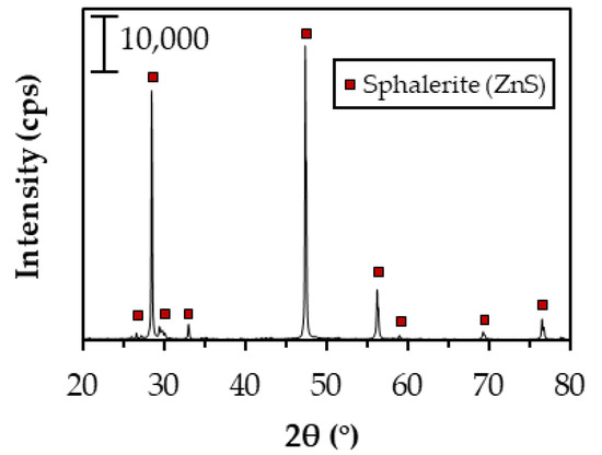 Five types of minerals were used in this study: sphalerite (ZnS, Kamioka Mine, Hida, Japan), lead sulfate (PbSO4, 98% purity), lead carbonate (PbCO3, 99% purity), lead chloride (PbCl2, 99% purity), and quartz (SiO2, 99% purity). The lead compounds and quartz were obtained from FUJIFILM Wako Pure Chemical Corporation (Osaka, Japan). A mineral specimen of ZnS was characterized using X-ray fluorescence spectroscopy (XRF, EDXL300, Rigaku Corporation, Tokyo, Japan) and X-ray powder diffraction (XRD, MultiFlex, Rigaku Corporation, Tokyo, Japan), and its chemical and mineralogical compositions ware shown in Table 1 and Figure 1, respectively. The XRD pattern of ZnS implied that ZnS was relatively pure due to the absence of the peaks of common minerals such as SiO2. In preparation for the flotation experiments, ZnS was ground by a vibratory disc mill (RS 200, Retsch Inc., Haan, Germany) and screened to obtain a size fraction of −75 + 38 µm.
