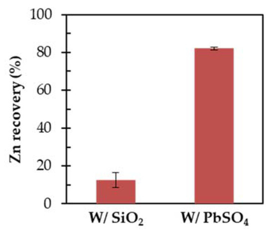 Figure 2 shows the flotation results of ZnS mixed with SiO2 or PbSO4. As can be seen, Zn recovery in the presence of SiO2 was ~12% but significantly increased to >80% when PbSO4 was present. It was reported that the affinity between ZnS and xanthate is poor, so the surface of ZnS needs to be modified using activators [21]. Since the solubility of PbSO4 is higher than that of PbS, a substantial amount of Pb2+ might be released into the pulp during the conditioning process when the ore contains PbSO4 [17]. As a result, lead activation of ZnS could occur (Equation (1)), thus increasing its floatability due to the formation of PbS-like compounds, having a higher affinity for xanthate than ZnS, on the mineral surface. In short, the presence of PbSO4 in the complex sulfide ores would negatively affect the separation of Cu-Pb from Zn. In addition, some portion of PbSO4 will remain undissolved and be rejected as tailings due to the poor affinity of PbSO4 for the collector (e.g., xanthate), which can cause lead contamination of the surrounding environment [28,29,36].