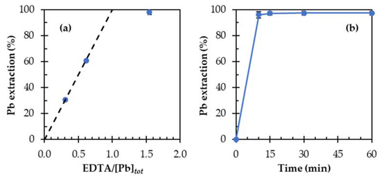 (a) Extraction efficiency of PbSO4 after 24 h with different concentrations of EDTA (100, 200, or 500 mM) and (b) effect of time on PbSO4 extraction with 500 mM EDTA. Note that the dotted line in Figure 3a corresponds to the ratio of EDTA/[Pb]tot.