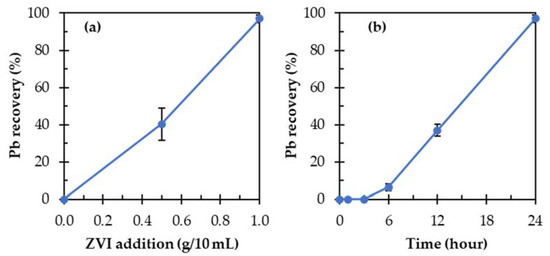 (a) Effects of the ZVI amount on the recovery of the extracted Pb after 24 h in the leachate after PbSO4 extraction using 500 mM of EDTA for 30 min and (b) effects of time on the recovery of the extracted Pb2+ using 1 g/10 mL of ZVI in the leachate after EDTA pretreatment using 500 mM EDTA for 30 min.
