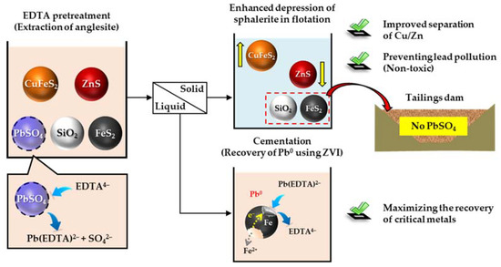 - The proposed method for complex sulfide ores containing PbSO4, a combination of extraction of PbSO4 using EDTA and recovery of extracted Pb2+ as zero-valent Pb by cementation using ZVI, could achieve enhanced selective flotation of complex sulfide ores (depression of ZnS floatability) while preventing lead pollution to the surrounding environment of tailings dams (removal of toxic PbSO4 before flotation) and maximizing the recovery of critical elements by cementation (recovery of Pb0 using ZVI).