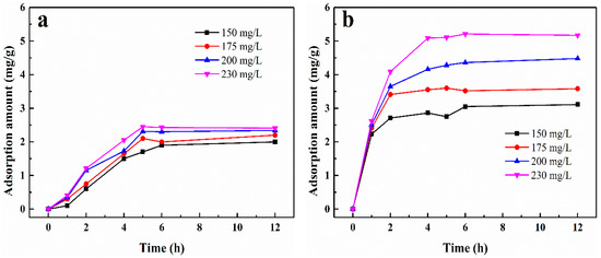 It can be seen that under different initial phosphorus concentrations, the adsorption capacity of sponge iron increases with the increase in adsorption time, and tends to be stable after a period of time. The adsorption equilibrium of unmodified sponge iron was reached after 6 h, while that of modified sponge iron was reduced to 4 h. In the early stage of the adsorption process, the adsorption rate of sponge iron to phosphorus is faster, and the phosphorus removal rate reaches 90% when the adsorption time was 4 h. The reason may be that there are many adsorption points on the surface of sponge iron at the initial stage of adsorption, the difference in ion concentration is large, and phosphorus can be easily combined with the surface of sponge iron [38,40]. With the decrease in adsorption sites on the surface of sponge iron, the adsorption rate slows down and reaches adsorption saturation [35].