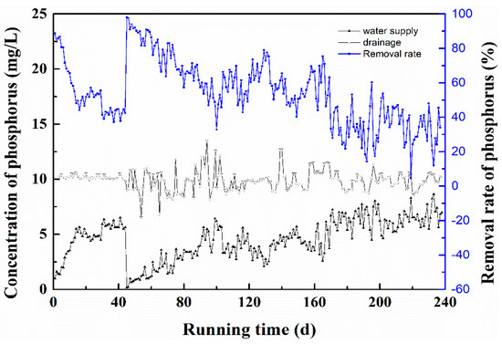 A continuous flow experiment was carried out to investigate the dynamic phosphorus removal characteristics of sponge iron. The relationship between phosphorus removal rate and operation time is shown in Figure 5.